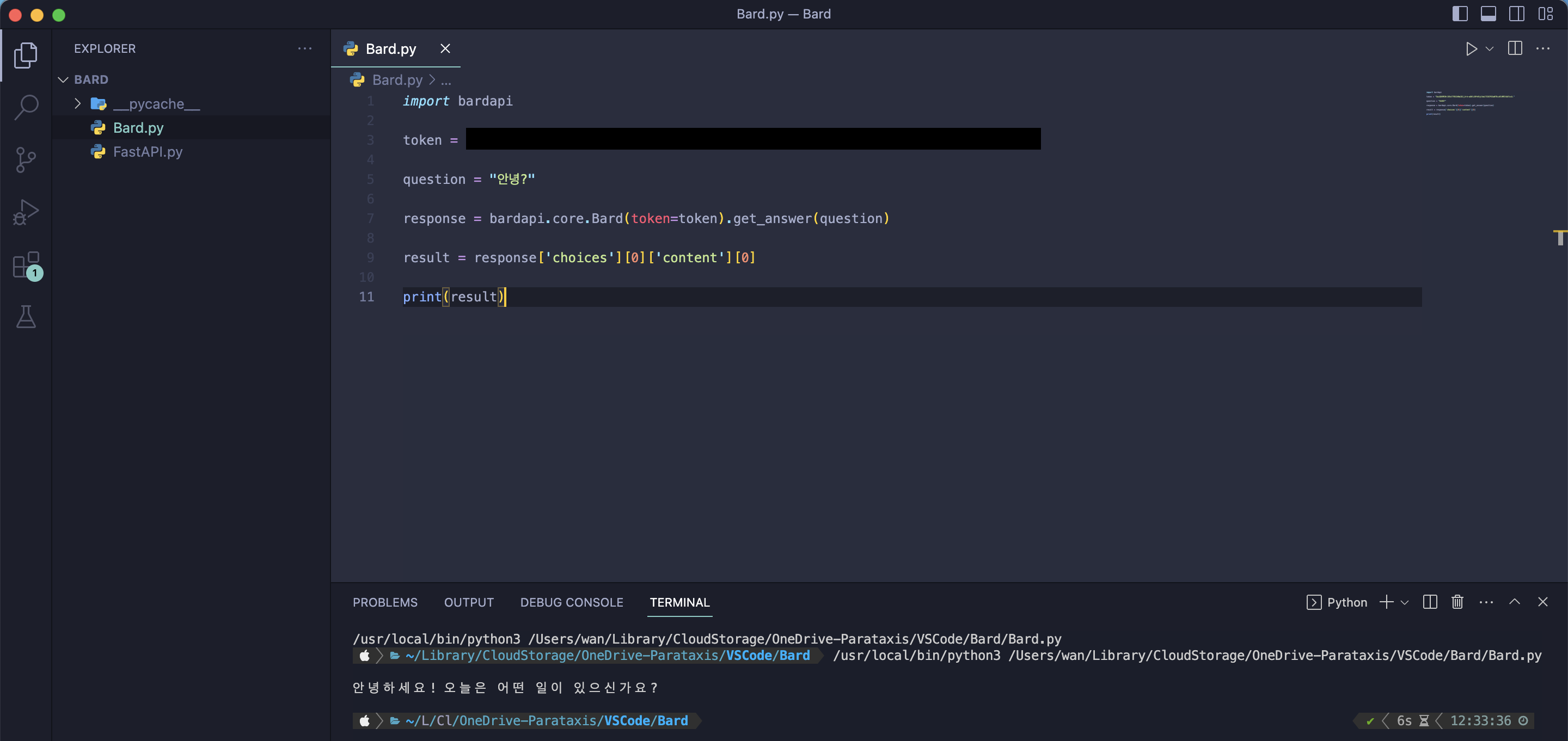 위 코드를 복사해서 VSCode의 Python 파일에 붙여넣고 복사한 바드 쿠키를 저기(YOUR TOKEN HERE)에 넣는다.