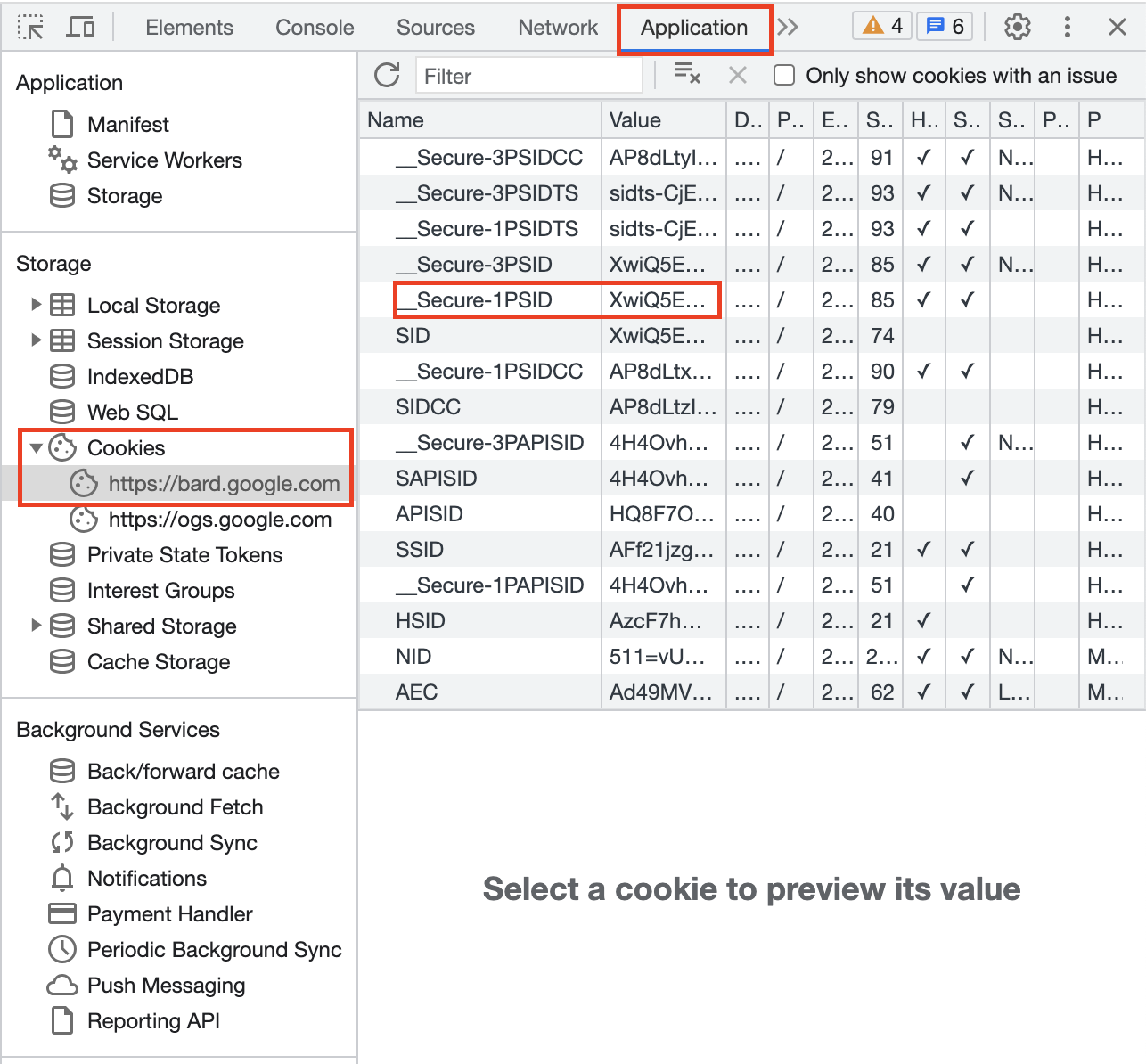구글 바드 홈페이지에 접속해서 F12를 눌러서 Application 탭에서 Cookies에 __Secure-1PSID의 Value를 .까지 포함해서 전부 복사해둔다.