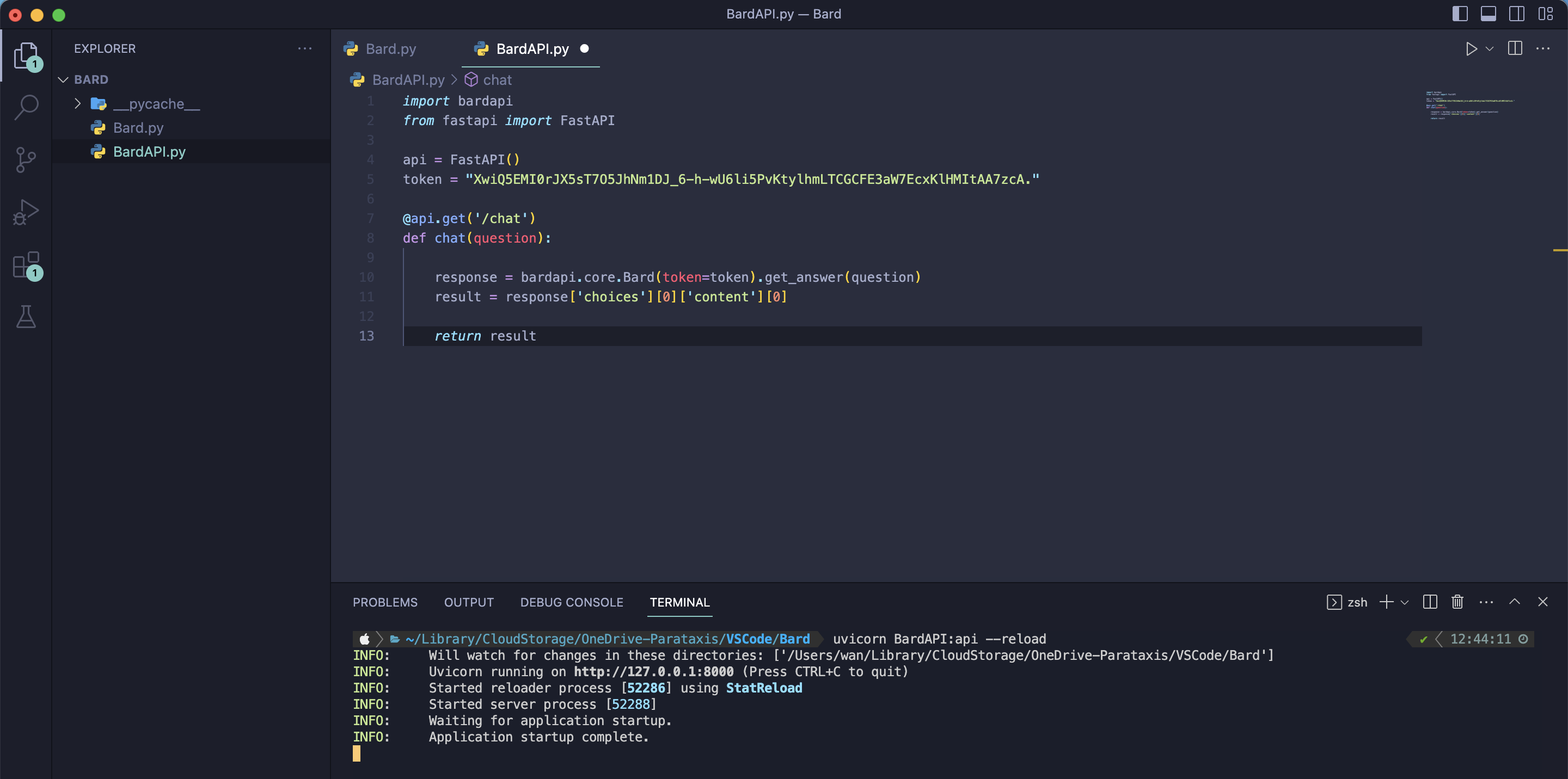 마찬가지로 쿠키를 token에 넣고 Terminal 열어서 uvicorn BardAPI:api --reload 명령어로 실행해보자.
