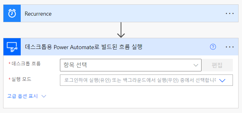 데스크톱 흐름을 선택하고 실행 모드를 유인/무인으로 설정하면 끝이다.