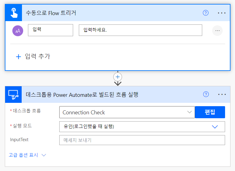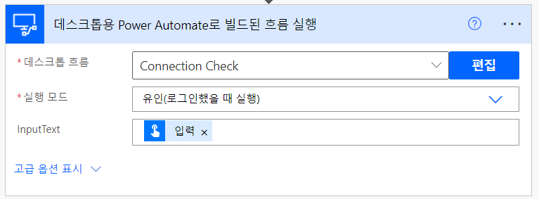 데스크톱 흐름을 찾아 넣고 실행 모드는 유인으로 한다.