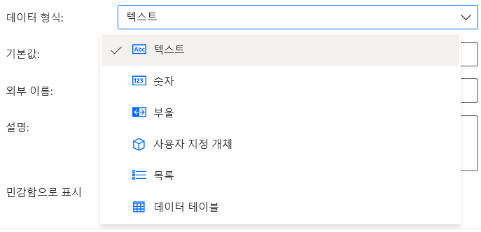 데스크톱 흐름에서 쓸 변수 이름을 정하고, 클라우드에서 보일 변수 이름은 외부 이름으로 설정한다.