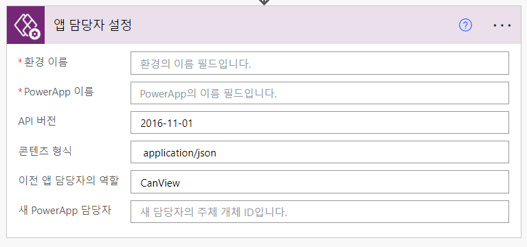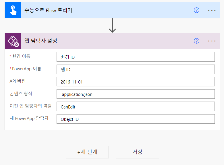 5. '새 PowerApps 담당자'도 사용자 ID를 넣어야 하는데, 이것은 오피스 로그인 할 때의 ID(계정)가 아니고 Azure Active Directory에서 Object ID(개체 ID)를 말하는 것이다.