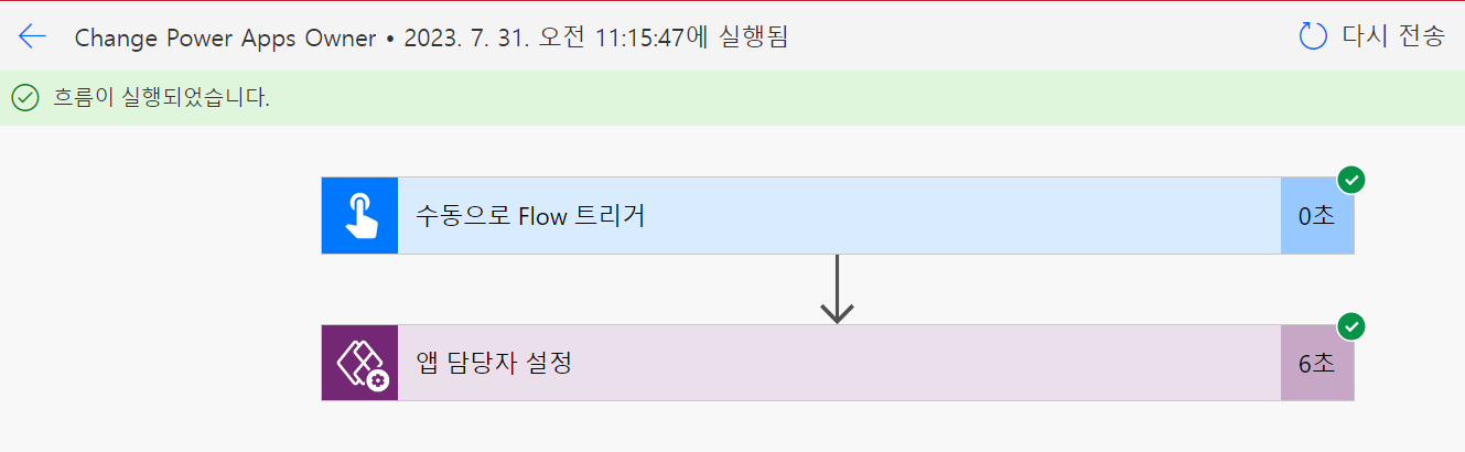 별다른 문제가 없다면 흐름이 실행되고 앱 소유자가 변경됐을 것이다.