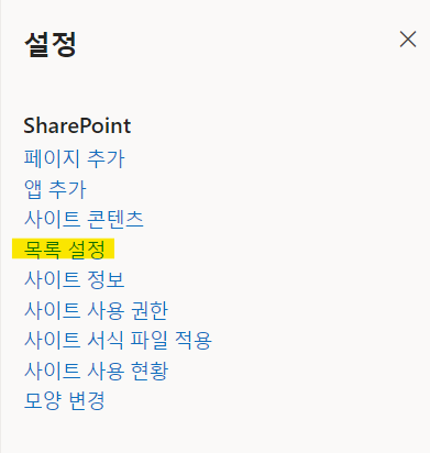 SharePoint List 오른쪽 상단 톱니바퀴(설정)에서 목록 설정에 들어간다.