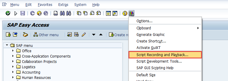 SAP에서 트랜잭션이나 작업을 자동화 하기 위해서 VBScript를 녹화하고 실행하는데, 그림에 표시된 메뉴가 비활성화 되어있는 경우가 있다.